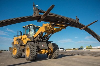 The company chose the 4.0-cu.-yd. capacity SDLG LG959 model to meet its capacity needs. The two loaders are fitted with 12-ft. forks to move 40-ft. bundles of rebar with many of the loads weighing up to 6 tons.